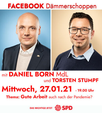 Zum Facebook Dämmerschoppen am Mittwoch, 27.01.21 um 19.00 Uhr darf ich Daniel Born, Landtagsabgeordneter aus dem Wahlkreis Schwetzigen zum Thema: "Gute Arbeit, auch nach der Pandemie" begrüßen. Wir wollen miteinander diskutieren wie die Arbeit in Zukunft aussehen wird, welche Probleme es gibt und was die Politik zur guten Arbeit beitragen muss. Dazu laden wir recht herzlich live auf meinem Facebook Profil ein oder ihr könnt direkt daran teilnehmen über Zoom: https://us02web.zoom.us/j/87910028555...